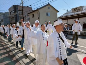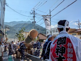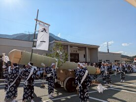 午後は祭典の習礼の後、神青会関係者も法被と鉢巻を身に纏い、御木曳行事に参加しました。私たちが参加したのは午後三時頃と、とても日差しが強く、気温も高い中でしたが、地元の若連中の皆さんの木遣り唄と掛け声に合わせ、誰一人欠けることなく曳行行事を奉仕することができました。奉仕させて頂いたことは勿論のこと、御料木となる御神木を間近に見られる経験というのは滅多にないことであり、本当に貴重な体験をさせて頂いたと思います。