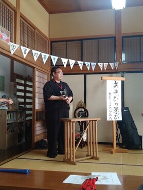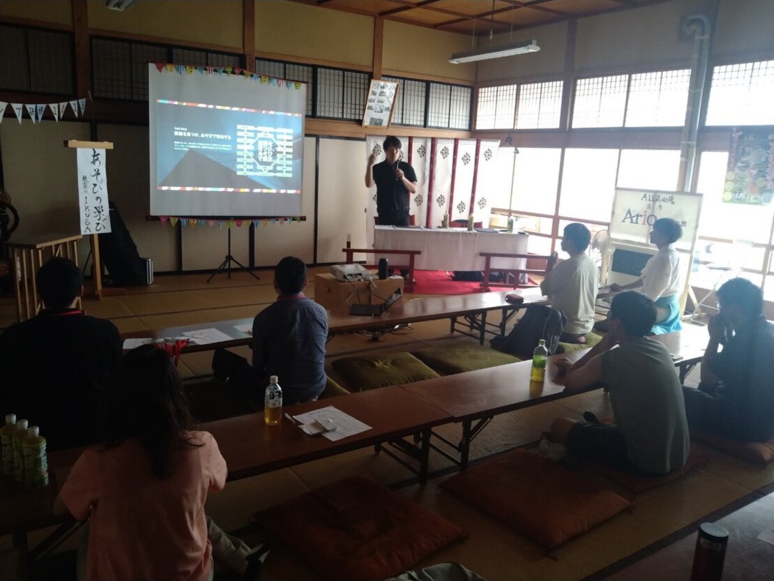 一日目の第一講として講師に株式会社IKUSAの代表である赤坂大樹先生、あそびコンサルタントの松元太先生にお越しいただいた。同社は企業、団体向けに遊びを通じて社長を始め会社全体の親睦や結束を促す研修や企画を提供する企業である。