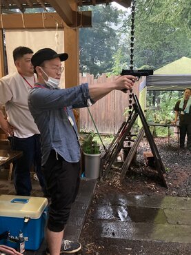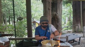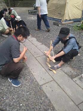 第二講として被災神社での炊き出しを想定し火起こし器を用いて火を起こし、限られた材料で調理を行う訓練を行った。